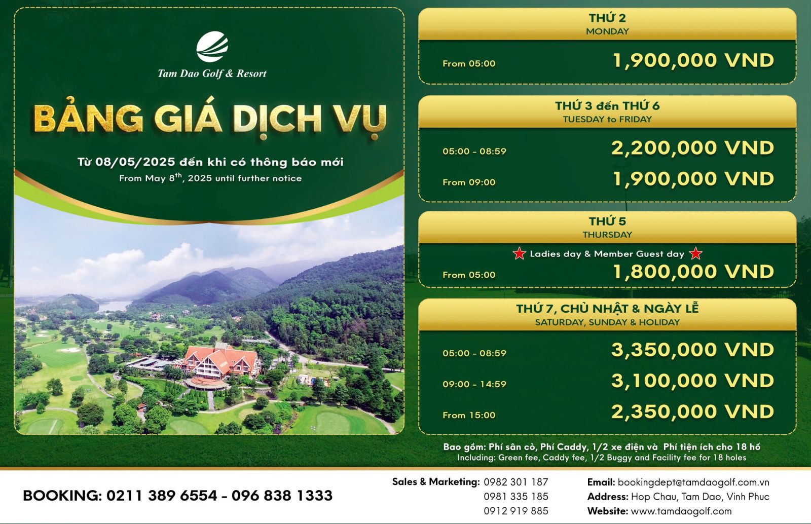 BẢNG GIÁ DỊCH VỤ ÁP DỤNG TỪ 8/5/2025 – SÂN GOLF TAM ĐẢO