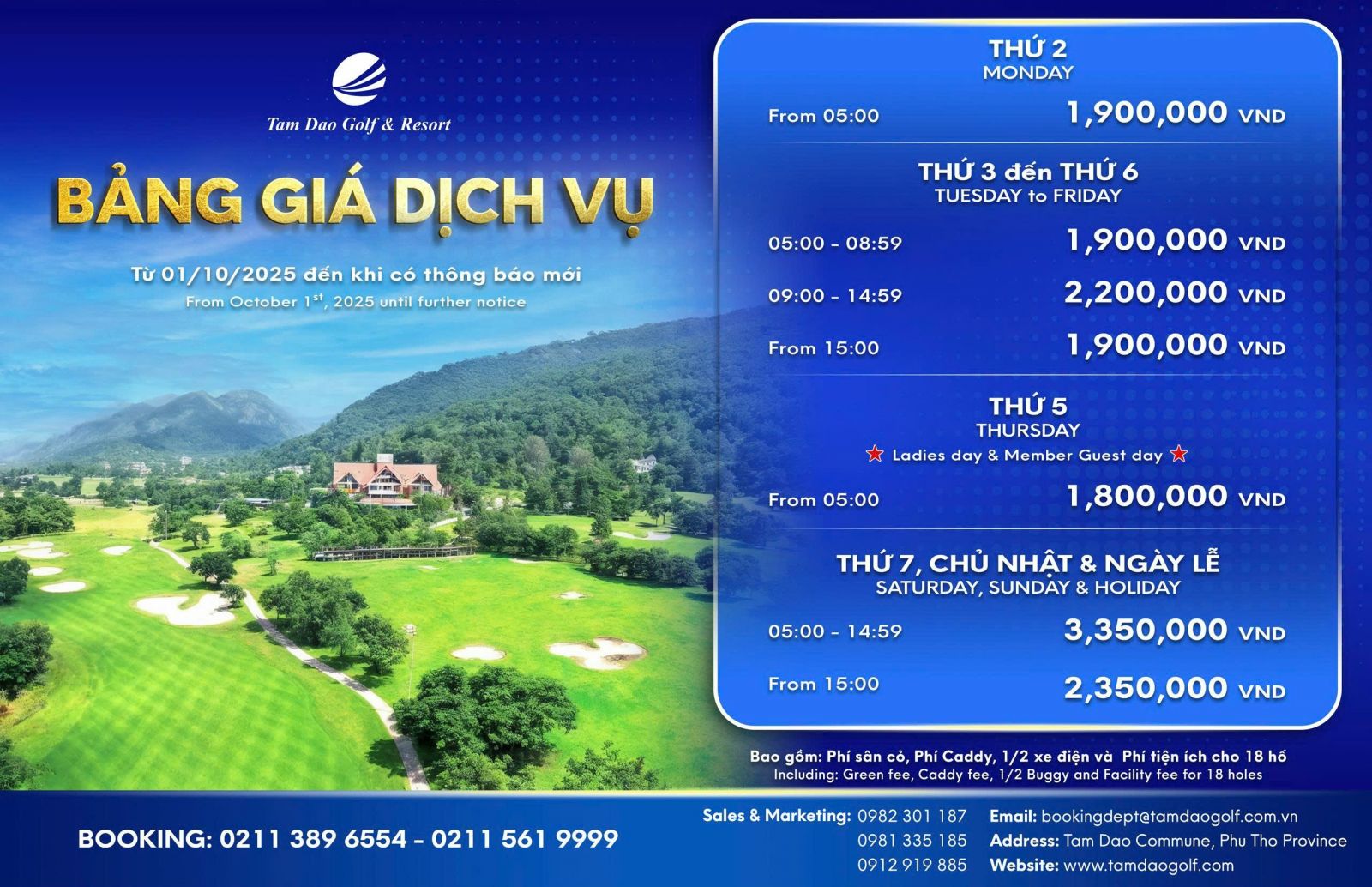 BẢNG GIÁ DỊCH VỤ SÂN GOLF TAM ĐẢO - ÁP DỤNG TỪ 01/10/2025