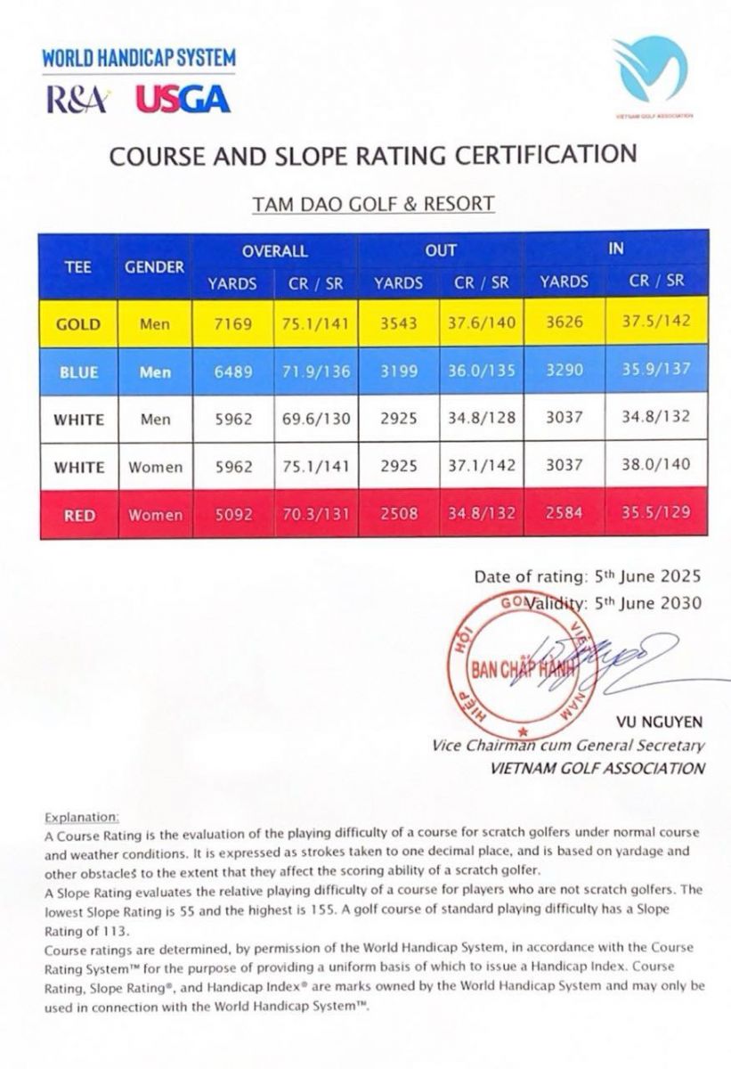 Ngày 5/6/2025 vừa qua, Hiệp hội Golf Việt Nam (VGA) đã chính thức cấp chứng nhận Course & Slope Rating cho sân Tam Dao Golf & Resort, áp dụng đến năm 2030.