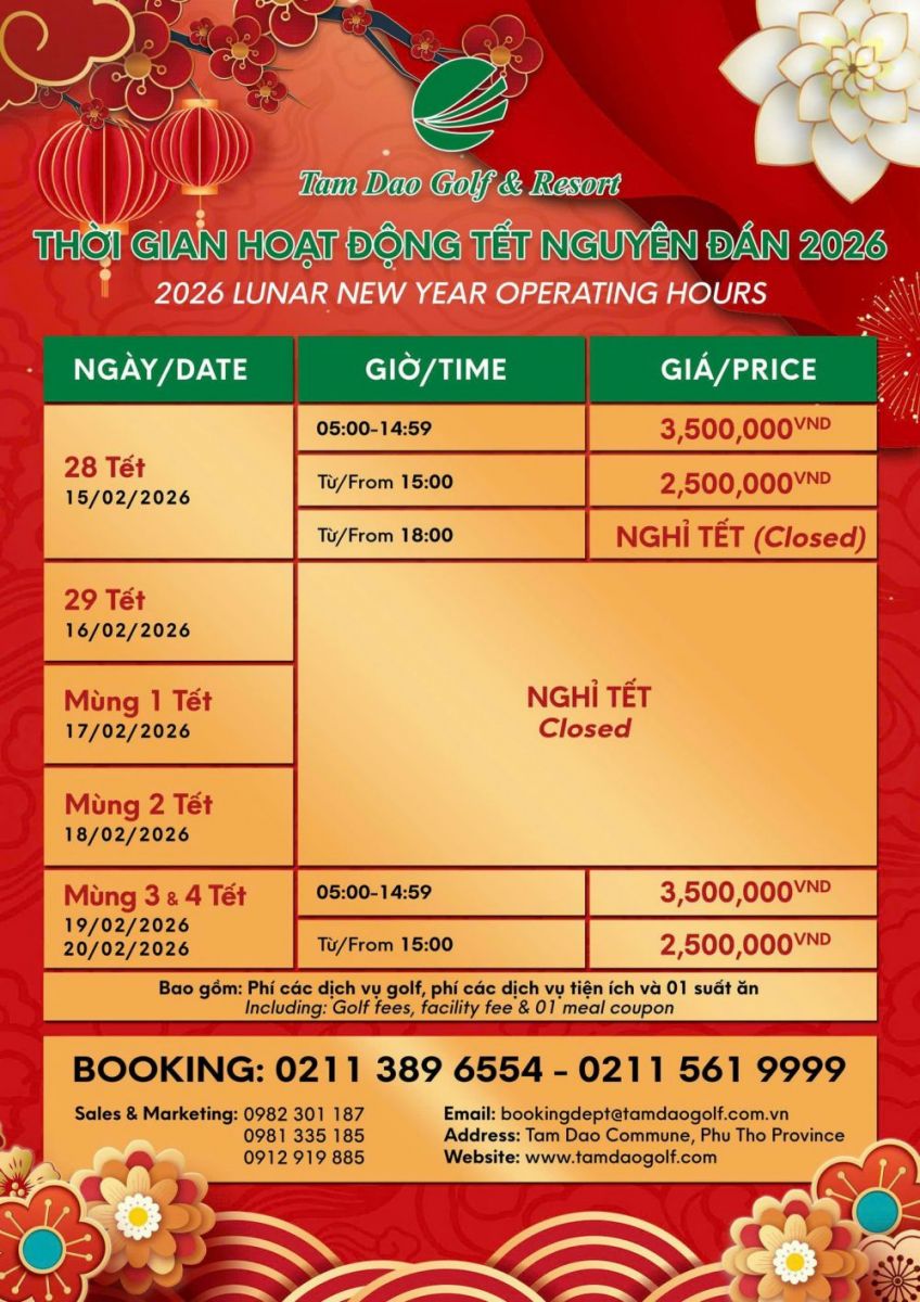 THÔNG BÁO LỊCH NGHỈ TẾT NGUYÊN ĐÁN 2026Nhân dịp Tết Nguyên Đán 2026, Sân Golf Tam Đảo xin trân trọng thông báo: