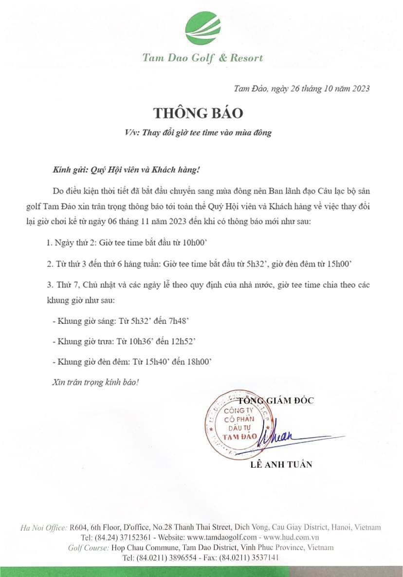 THÔNG BÁO THAY ĐỔI GIỜ TEE TIME VÀO MÙA ĐÔNG ÁP DỤNG TỪ 06/11/2023