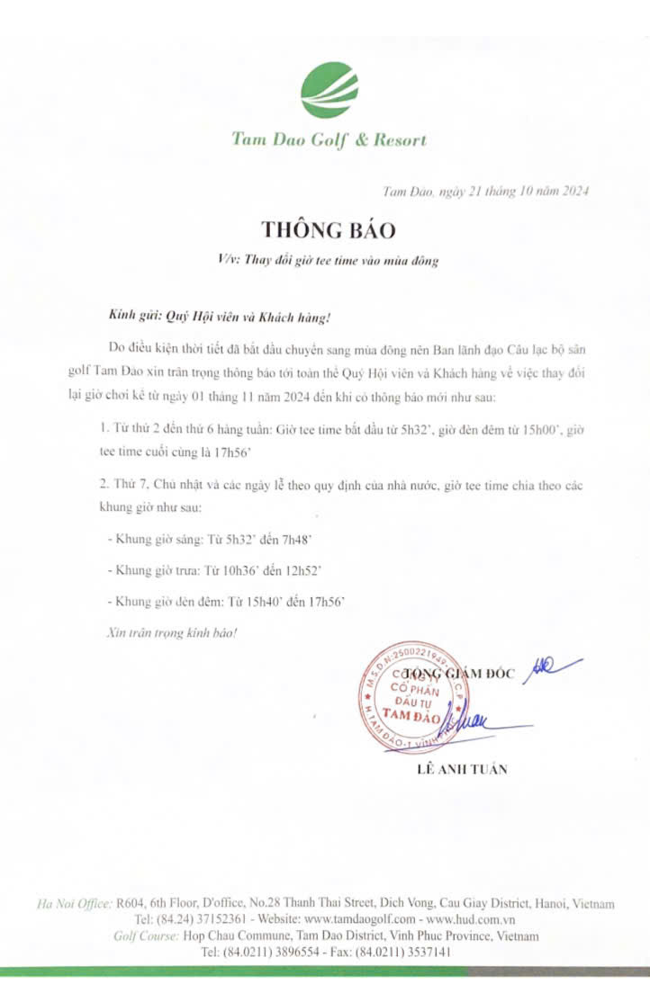 Do điều kiện thời tiết đã bắt đầu chuyển sang mùa đông nên Ban lãnh đạo Câu lạc bộ sân golf Tam Đảo xin trân trọng thông báo tới toàn thể Quý Hội viên và Khách hàng về việc thay đổi lại giờ chơi kể từ ngày 01 tháng 11 năm 2024 đến khi có thông báo mới như sau: